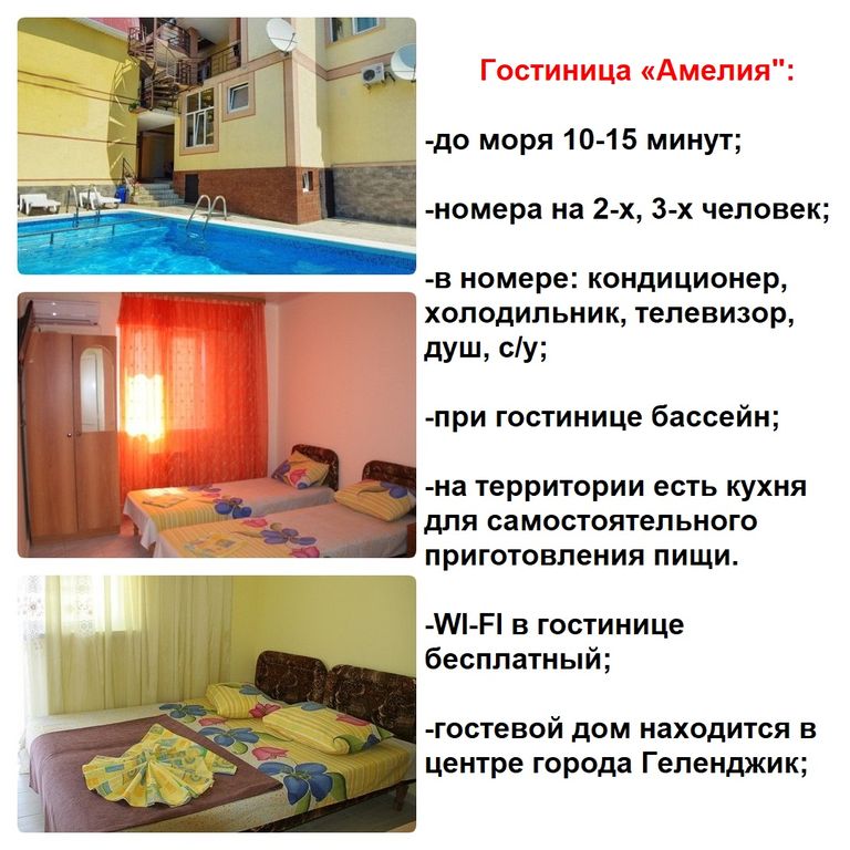 Гостиница «Амелия» находится недалеко от центра города-курорта, на тихой, спокойной улице. До моря и знаменитой набережной — не более 10-15 мин спокойным шагом по тенистой улице, по дороге кафе, магазины, остановка общественного транспорта. Вся инфраструктура рядом, в шаговой доступности. В номерном фонде представлены семейные номера, в которых можно разместить до 4 человек. В каждой комнате есть удобные кровати, кондиционер, телевизор с большим количеством каналом и собственная ванная. Из окон открывается красивый вид на окрестности. В здании гостевого дома есть общая кухня, где можно приготовить себе еду самостоятельно. До ближайшего продуктового магазина пара минут ходьбы. Также рядом есть несколько недорогих столовых с большим ассортиментом домашних блюд.