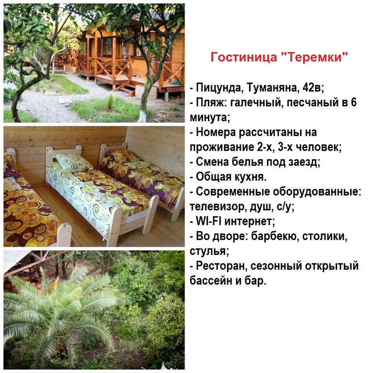 Гостиница «Теремки» находится между городами Гагра и Пицунда, в Алахадзы на первой береговой линии. Отдельно стоящие, экологически чистые деревянные домики с верандой, в окружении экзотической зелени, помогут спрятаться от любопытного взгляда и уединится с природой. В шаговой доступности рынок, магазин, маршрутная остановка, аптека. До центра развлечений в г. Гагра такси или маршрутки, 10 - 15 минут езды.