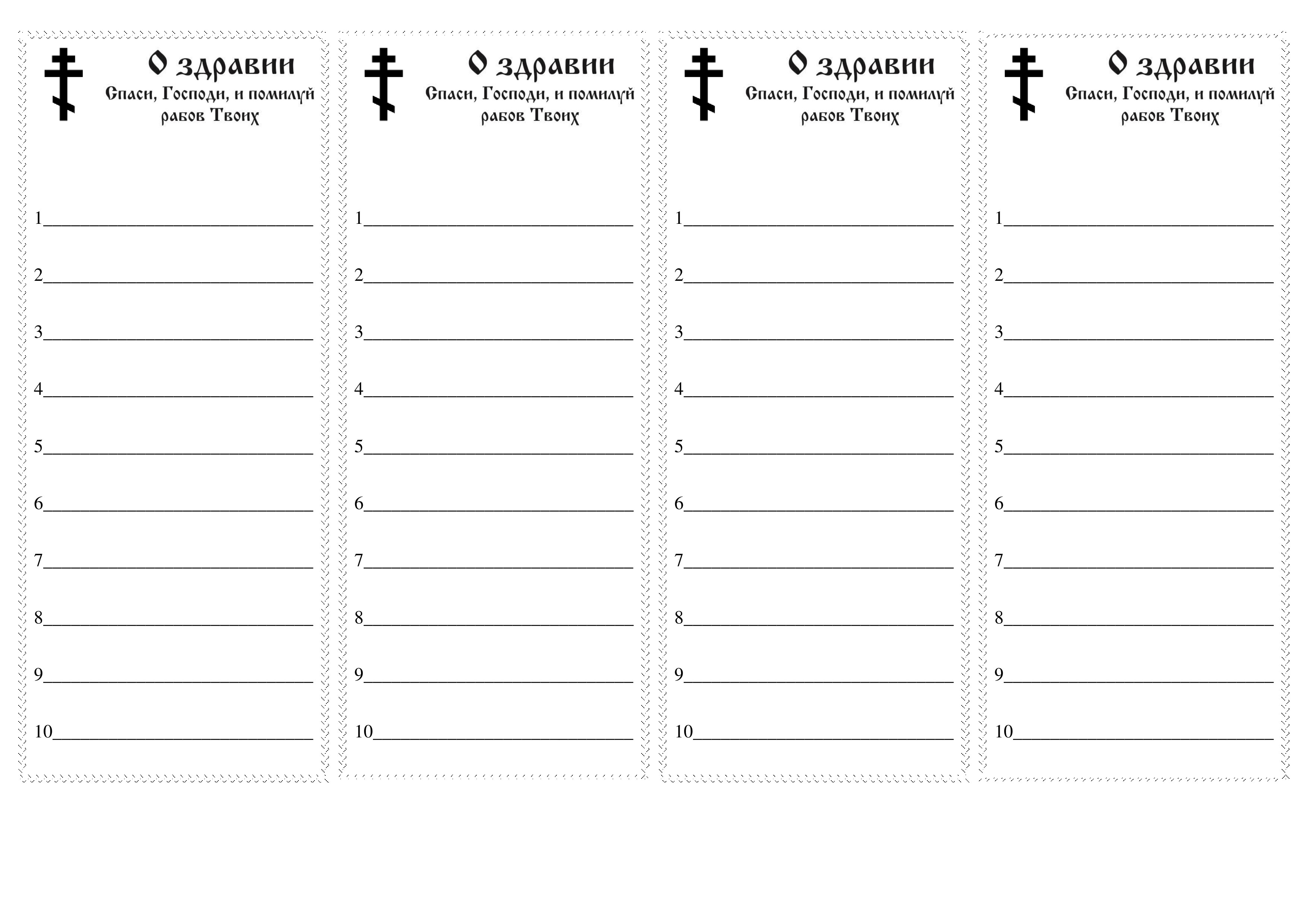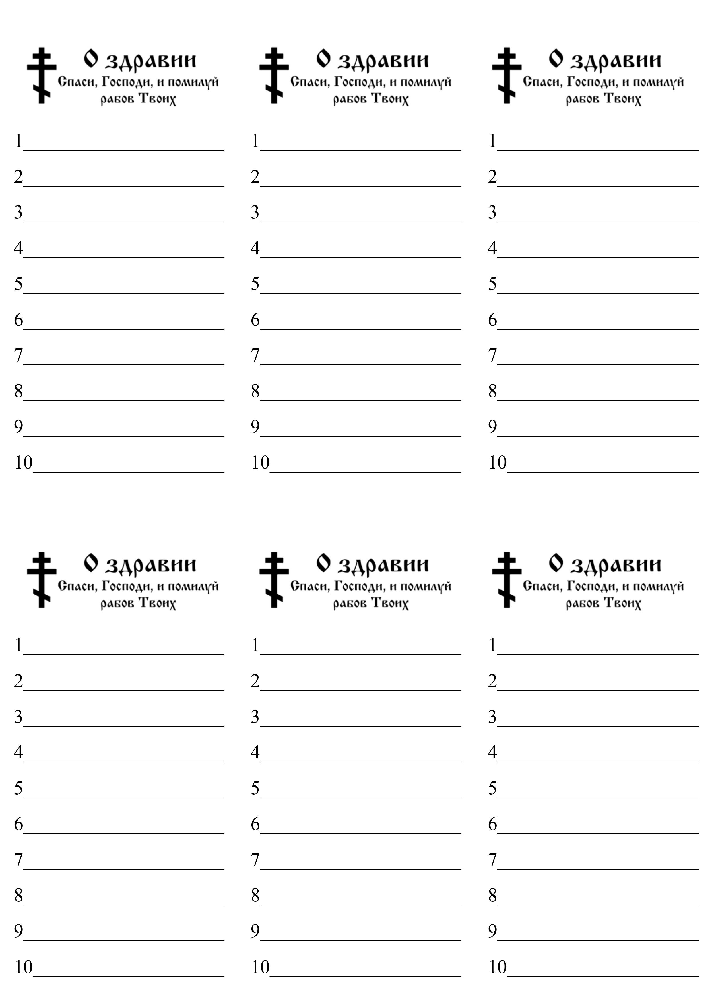 Первая записка, подаваемая нами - "О здравии". Понятие "здравие" включает не только здоровье, физическое состояние человека, но и его духовное состояние, материальное благополучие. И если мы молимся о здравии человека, который сделал много зла, то это не значит, что мы молимся о том, чтобы он и в дальнейшем пребывал в таком же состоянии - нет, мы молим Бога, чтобы Он переменил его намерения и внутреннюю неустроенность, сделал так, чтобы наш недоброжелатель или даже враг стал пребывать в гармонии с Богом, с Церковью, с окружающими, обязательно впишите его имя для молитвенного поминовения, по заповеди Господа: (любите врагов ваших, благословляйте проклинающих вас, благотворите ненавидящим вас и молитесь за обижающих вас и гонящих вас" (Мф. 5, 44). Молитва за врагов, за враждующих - великая сила для прекращения вражды и водворения мира. Сам Спаситель молился за врагов. Известно множество случаев, когда один из враждующих вписывал имя своего недоброжелателя в записку о здравии рядом со своим именем - и вражда прекращалась, бывший враг становился доброжелателем. В эту записку следует записать всех, кому мы желаем здравия, спасения и благоденствия.