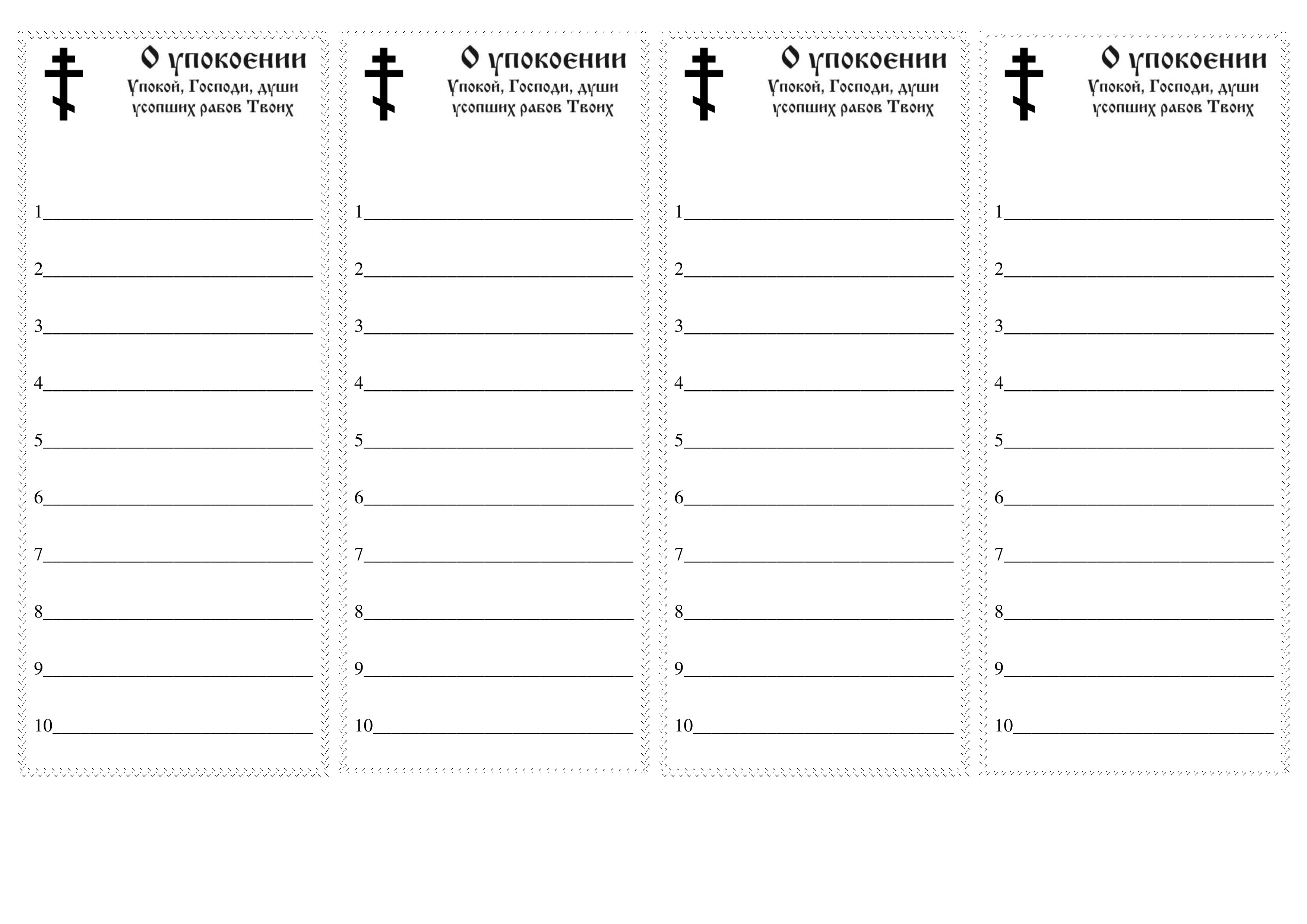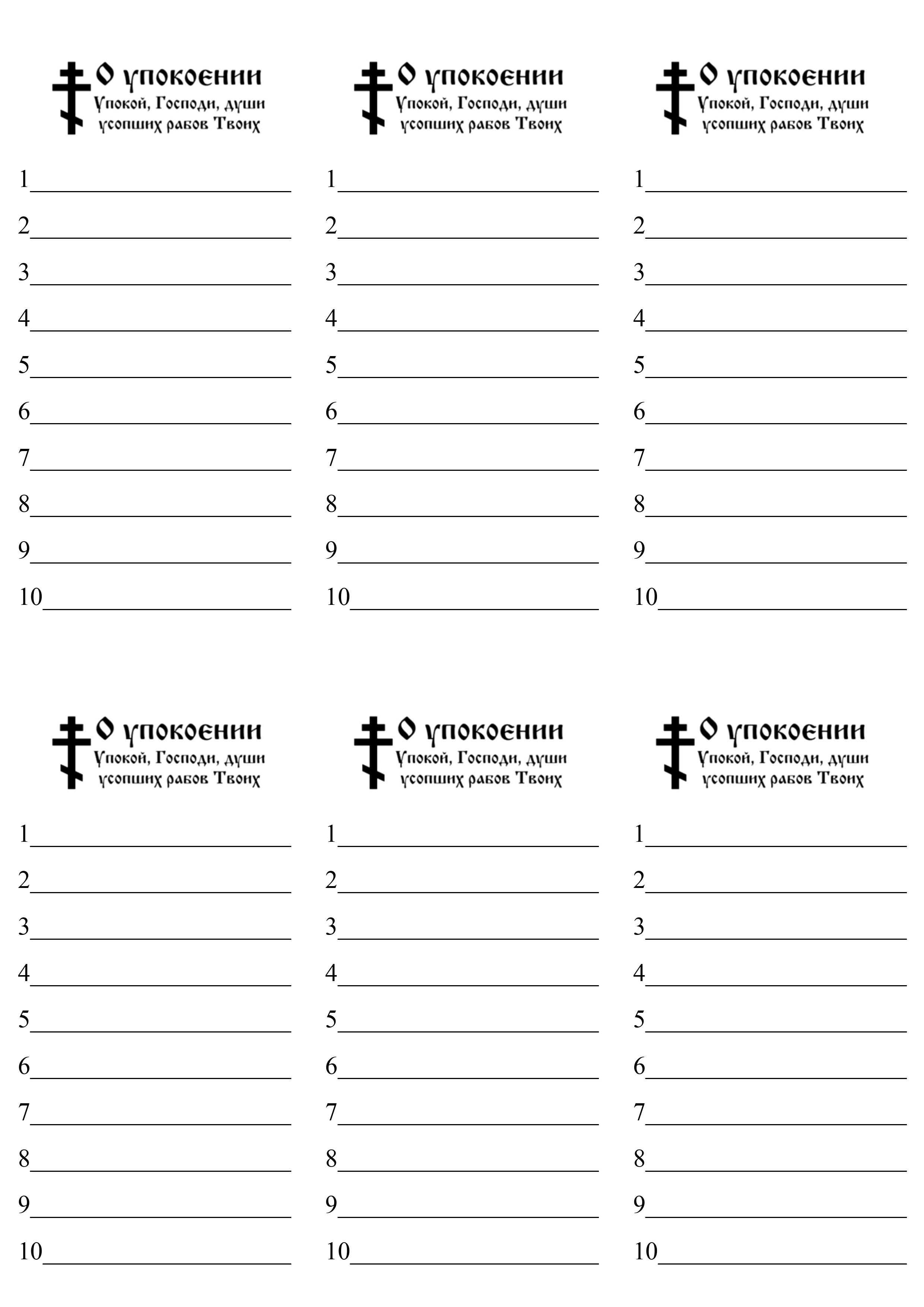 Вторая записка, подаваемая нами - "О упокоении". В ней мы пишем имена усопших сродников, знакомых, учителей, благожелателей, всех, кто нам дорог. Как молимся мы о живых, так должны молиться и за умерших - и не только за ближайших сродников, но и за весь свой род, за всех, кто сделал нам добро в земной жизни, помог, научил. Умершие, хотя и отошли от нас, хотя и пребывают плотью в земле, а душой у Господа, не исчезли, продолжают жить невидимой для нас духовной жизнью пред очами Божиими, так как Сам Господь говорит в Святом Евангелии: "Бог же не есть Бог мертвых, но живых, ибо у Него все живы" (Лк. 20, 38). Мы верим, что наши усопшие сродники, а имен многих из них мы часто и не знаем, молятся о нас, своих потомках. Мы, живущие на земле, составляем с отшедшими от нас одну Церковь, одно тело, имеющее Одну Главу - Господа Иисуса Христа. "Живем ли - для Господа живем; умираем ли - для Господа умираем: и потому, живем ли или умираем, - всегда Господни. Ибо Христос для того и умер, и воскрес, и ожил, чтобы владычествовать и над мертвыми и над живыми" (Рим. 14, 8-9). Единство и общение наше с умершими особенно чувствуется во время усердной молитвы за них. Она производит на душу молящегося чрезвычайно глубокое действие и впечатление, доказывая действительное общение души молящегося с душами тех, за кого возносится молитва.
