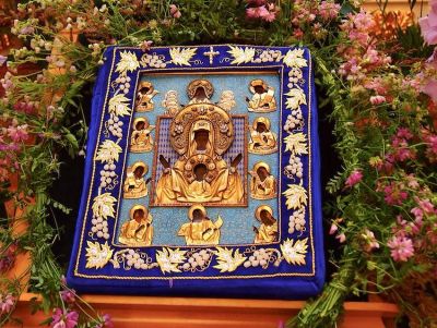 Курская-Коренная икона. Чудотворная Курская Коренная икона Божией Матери «Знамение» была обретена 25 сентября 1295 года, когда в день праздника Рождества Пресвятой Богородицы в 27 верстах от Курска в корнях большого вяза на берегу реки Тускарь охотники нашли небольшую икону. Как только икона была поднята с земли, из-под нее забил источник, который не иссяк и по сей день. Охотники срубили на святом месте небольшую часовенку и поставили в ней чудесно явленную икону. С той поры началось всенародное почитание новообретенного образа, получившего название Курской Коренной, т.е. найденной у корней, иконы Божией Матери.
